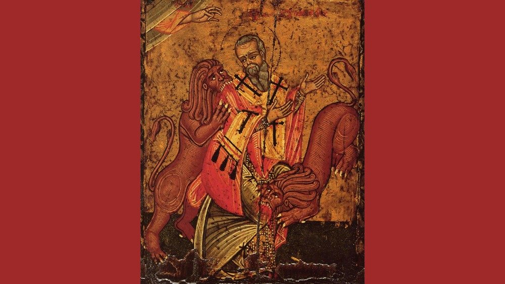 E, si arriti në Romë në vitin 107, ipeshkvi i Antiokisë u blua vërtetë nga dhëmbët e bishave të pafajshme të cirkut, për të cilat Martiri gjeti shprehje poetike të pazakonshme: “Përkëdhelini – shkruante – që të jenë varri im; të mos lënë gjë prej gjëje nga trupi im e të mos trazohet askush për të më varrosur!”. Vdiq martir në vitin 107 pas Krishtit.
