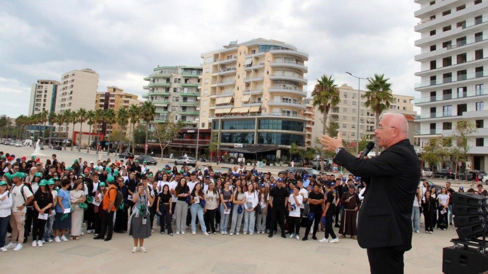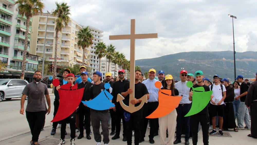 E ndërsa shtegtonin me pankarta në duar nën moton “Shpresa nuk Zhgënjen” të gjithë u bashkuan në sheshin kryesor të Lungomares ku u priten nga Ipeshkvi vendas, Imzot Giovanni Peragine, i cili falenderoi të rinjtë për praninë e tyre. Ju jeni dëshmi sot në mënyrë të veçantë për gjithë Vloren, ku me dëshminë tuaj ndiqni shpresën e Zotit.