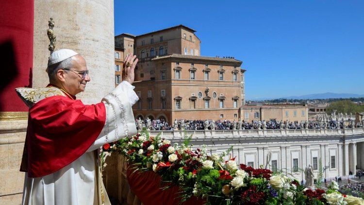Me kardinalin shqiptar Ernest Simoni, i pranishëm në lozhën qendrore të Bazilikës së Shën Pjetrit, Papa Leoni XIV kumton Ringjalljen e Krishtit si një forcë jo të dhunshme, që e ndryshon historinë dhe denoncon "globalizimin e indiferencës" para konflikteve bashkëkohore. I fton të gjithë që më 11 prill të luten me të për paqen