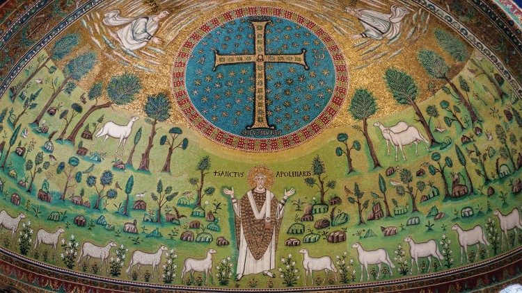 Святий Аполлінарій зображений у центрі класичної апсиди в урочистій прямій позі, із золотим німбом навколо голови. Його обличчя окрашене сніжно-білою бородою, руки підняті вгору з долонями, зверненими до небес – вираження прохання про благодать для вірних у повній довірі та підпорядкуванні Божій волі. Єпископ Равенни одягнений у білу туніку і ризи, прикрашені численними золотими бджолами – символом красномовства та працьовитості, а на плечах у нього паллій з овечої вовни, який символізує місію душпастиря і його піклування про стадо. Святий Аполлінарій у оточенні дванадцяти овець є видимим символом Церкви Равенни в її земному паломництві до Бога.