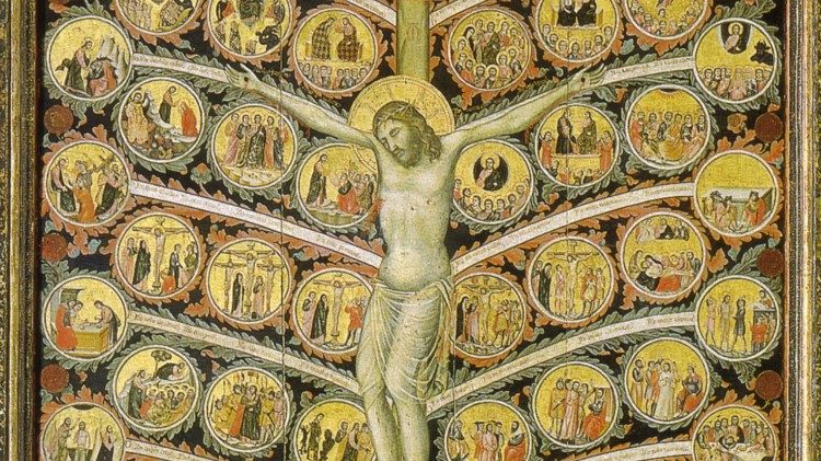 Описану дійсність Церкви – від створення до хресної жертви Ісуса – чудово змальовує картина під назвою: «Дерево життя», яку приписують флорентійському художнику XIII століття Пачіно ді Буонаґвідо (+ бл. 1339). Сюжет твору натхнений змістом книги «Lignum Vitae» (Дерево життя) святого Бонавентури, у якій давній архетип дерева життя злився з історією Христового хреста. Твір поділено на дванадцять «гілок» або «плодів» і сорок вісім глав або медитацій, відтворених на картині. Внизу зображено основні історії з книги Буття (створення людини, вказування на заборонене дерево, первородний гріх тощо), які тісно пов’язані з темою Дерева пізнання добра і зла, що переплітається з животворним деревом хреста. Ці сцени розділено пагорбом з Голгофою в центрі, посередині якого в темній ніші, стоїть францисканець з розгорнутою книгою, ймовірно святий Бонавентура з «Lignum Vitae». Над сценами книги Буття зображено чотири святих та пророків: Мойсея, святого Франциска з Ассізі, святу Клару та євангелиста Івана Богослова з чотирма сувоями. З вершини Голгофи проростає Дерево життя з дванадцятьма гілками і сорока сімома сценами, які відображають епізоди з життя Ісуса Христа, включно із зісланням Святого Духа та сидінням праворуч Отця. Крім того, тут зображено сцени коронування Пречистої Діви Марії та Страшного суду. Завершує композицію місто Рай, де з його мурів видніються чітко упорядковані престоли святих, пророків і блаженних, що увінчуються престолами Пресвятої Богородиці і Христа у славі. Сюжети зображені на картині «Дерево життя», є наочним виявом віровчення, який пропонує глядачеві принадні зображення для роздумів.