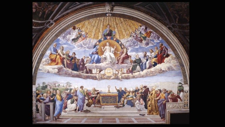 Отож єдність людства з Христом є невід’ємною завдяки Його хресній жертві. Церква, яку ІІ Ватиканський Собор називає Таїнственним Тілом Христовим, є глибоко закорінена в Христі, живлячись Божим словом та Пресвятою Євхаристією. Христос єднає Церкву-паломницю на землі із Церквою прославленою – небесною. Цю єдність яскраво зображує Рафаель Санті у своїй відомій картині «Диспут про Святе Таїнство», яка знаходиться у Музеях Ватикану. Композиція чітко розділена між небесним і земним просторами, які об’єднуються завдяки центральному елементу – Пресвятій Євхаристії, поміщеній у монстранцію, яка встановлена на ромбічній основі, а ромб – символ досконалості. У своїй живописній мудрості Рафаелю вдалося передати істину, що життя Церкви і кожного віруючого обертається навколо точки опори: Ісуса у Пресвятій Євхаристії. Вона виражає нерозривний зв’язок між Христом і Церквою: Церква звершує Євхаристію, а Євхаристія формує Церкву. У нижній частині твору можна помітити, як земна Церква ставить під сумнів саму себе, дискутує про природу, причини і глибину Святого Таїнства Євхаристії, яке художник майстерно розмістив у центрі як основоположний мотив. Цей образ наче розповідає, що протягом століть у Церкві поглиблювалося пізнання Євхаристії, перед якою пасує всяке людське мислення, оскільки це Святе Таїнство, на відміну від інших, містить у собі самого Бога. Серед науковців немає одностайної думки, чи ця сцена справді відображає суперечку, чи радше тріумф Євхаристії, на який вказують богослови та Вчителі Церкви. Ще один важливий елемент у верхньому ряді – воскреслий Ісус у славі. Саме завдяки воскресінню Його тіло вже не зв’язане жодними просторово-часовими обмеженнями, а тому Христос є присутній на землі у всіх освячених частичках хліба і вина, здійснюючи дану учням обітницю: «Я з вами по всі дні аж до кінця віку» (Мт. 28,20).