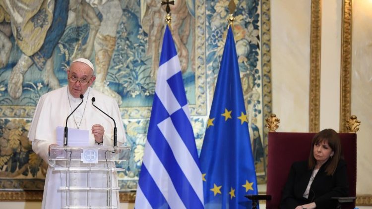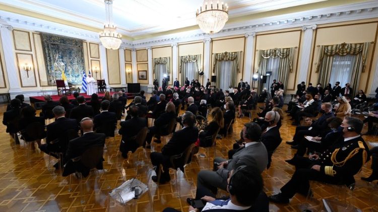 Свою першу промову в Греції Папа Франциск виголосив під час відвідин, 4 грудня 2021 р., Президентського палацу, де він здійснив візит ввічливості до Президентки країни, мав окрему зустріч із Главою уряду, а також зустрівся з представниками цивільної та церковної влади, дипломатичного корпусу, громадянського суспільства та світу культури.