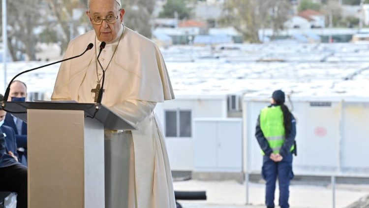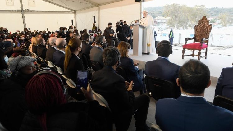 Прозвучали вітальне слово представників влади, місцевого єпископа та свідчення біженця і волонтера, після яких промовляв Папа, який підкреслив, що прибув, «аби побачити ваші очі та подивитися вам у вічі», згадуючи слова Патріарха Вартоломея І, сказані п’ять років тому: «Той, хто боїться вас, не дивився у вічі. Той, хто боїться вас, не бачив ваших облич».