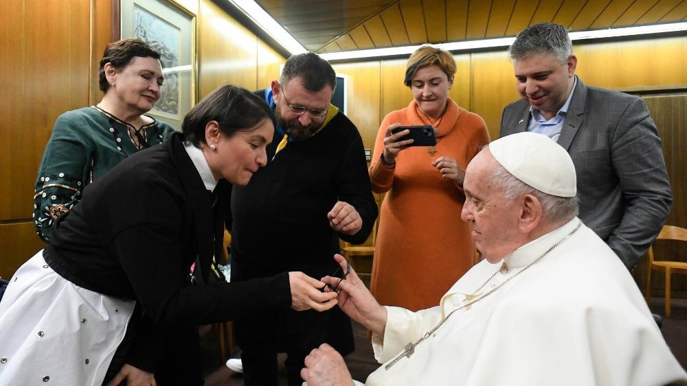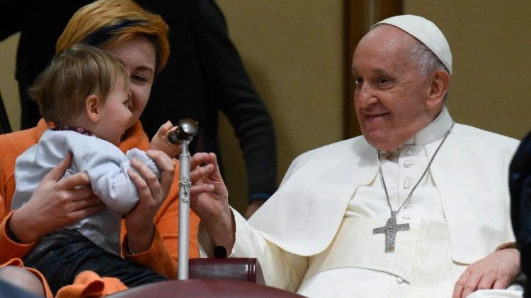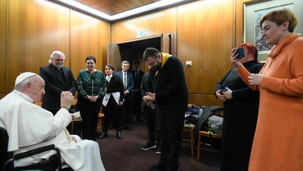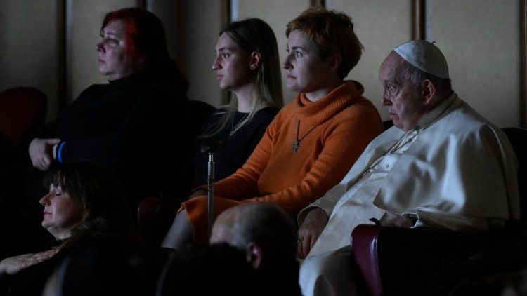 «Сьогодні вже рік цієї війни. Скеровуймо погляд до України, молімося за Україну, впустімо в наше серце біль. Ми не повинні соромитися страждати і плакати бо війна – це знищення, війна це завжди крок назад», – сказав Папа, зворушений переглядом, а тоді закликав помолитися разом, мовивши: