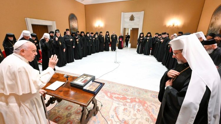 Папа Франциск уважно вислухав звернені до нього слова, висловлюючи кількома короткими репліками своє почуття близькості та співпереживання в трагедії, яку, зазнаючи жорстокості і потерпаючи від злочинів, переживають українці з «виміром мучеництва», про який недостатньо говориться. Він висловив свій смуток через відчуття безсилля перед обличчям війни, «творіння диявола, який прагне нищити», з особливою думкою про українських дітей, яких він зустрічав під час аудієнцій: «Вони дивляться на тебе і забули про усмішку», додаючи: «Це один з плодів війни: забрати в дітей усмішку».