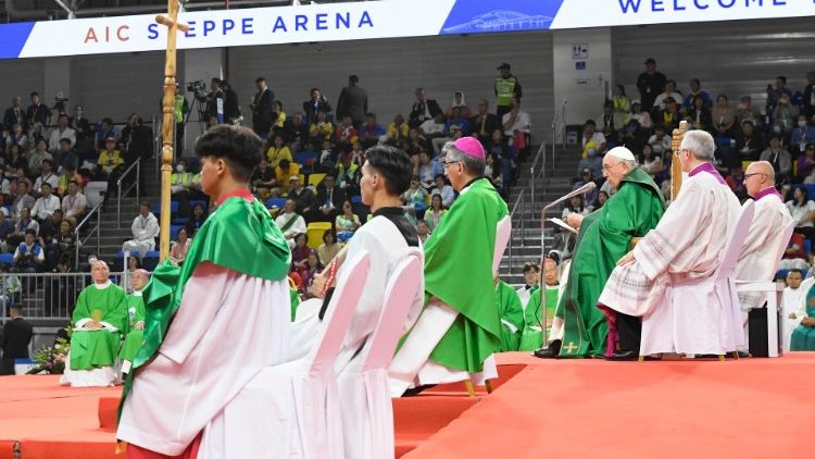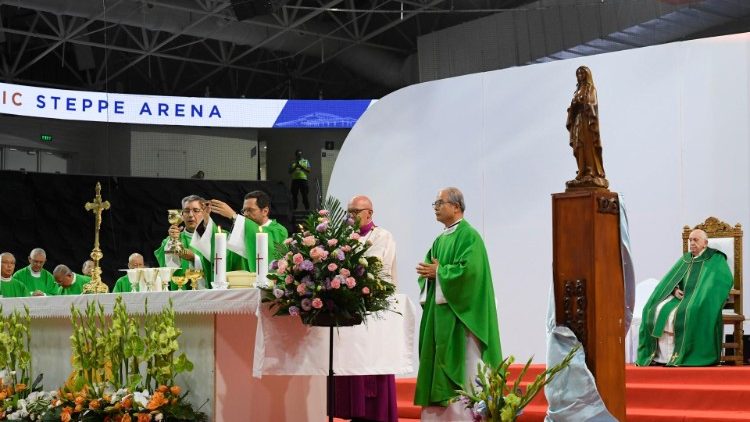 Завершенням третього дня перебування Папи Франциска у Монголії стала Свята Меса, яку він у неділю, 3 вересня 2023 р., очолив у льодовому палаці «Степова Арена». На Євхаристійне богослужіння з Наступником святого Петра зібралися місцеві католики, а також паломники із країн регіону. У своїй проповіді Святіший Отець відзначив стан людини, який характеризується, зокрема, пошуком радості та щастя, шукаючи відповідь, яка з’являється завдяки зустрічі з живим Богом.