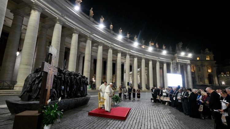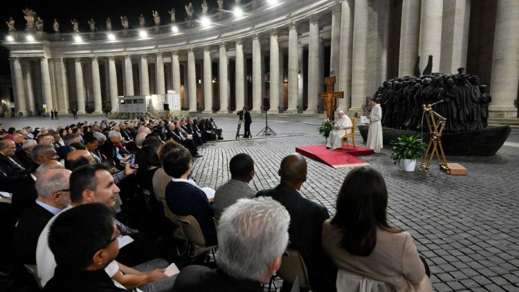 «Подібно до доброго самарянина, ми покликані бути поруч з усіма сьогоднішніми подорожніми, рятувати їхні життя, зцілювати їхні рани, полегшувати їхній біль. Для багатьох, на жаль, вже занадто пізно, і нам не залишається нічого іншого, як плакати над їхніми могилами, якщо вони є», – сказав Папа Франциск, промовляючи до учасників молитви за мігрантів і біженців, яка ввечері, 19 жовтня 2023 р., відбулася в рамках першої сесії XVI Звичайної Асамблеї Синоду Єпископів. Після завершення XIII загального зібрання, присвяченого представленню напрацювань робочих груп щодо четвертої частини Робочого документа, учасники асамблеї перейшли із залу Павла VI на площу Святого Петра до встановленого на ній пам’ятника мігрантам. Там відбулася Літургія слова, зосереджена навколо притчі про милосердного самарянина.