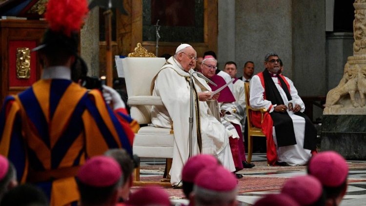 Перед початком богослужіння Папа Франциск, разом з Кентерберійским архиєпископом Джастіном Уелбі та митрополитом Полікарпом, представником Константинопольського патріархату, помолилися перед гробом святого Павла. В спільній молитві єдналися представники різних конфесій, які служать у Римі, а також члени Міжнародної змішаної комісії богословського діалогу між католицькою та орієнтальними православними Церквами, що відзначає двадцятиріччя своєї діяльності.