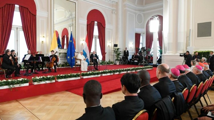 Щоб вилікувати небезпечний склероз, тобто забуття про помилки минулого, «що призводить до тяжкої хвороби народів», загрожуючи ввергнути їх «в авантюри з величезними людськими жертвами, відновлюючи даремні кровопролиття», потрібно дивитися вгору, потрібно, щоб щоденне життя народів і їхніх правителів «було натхнене високими і глибокими духовними цінностями, й ці цінності зможуть запобігти божевіллю розуму і безвідповідальному поверненню до тих же помилок, що і в минулому, посиленому більшою технічною могутністю, яку тепер має людина», – на цьому наголосив Папа Франциск, промовляючи до представників влади, громадянського суспільства й дипломатичного корпусу Люксембургу, зустрічаючись з ними у четвер, 26 вересня 2024 р., в конгресцентрі «Cercle Cité».