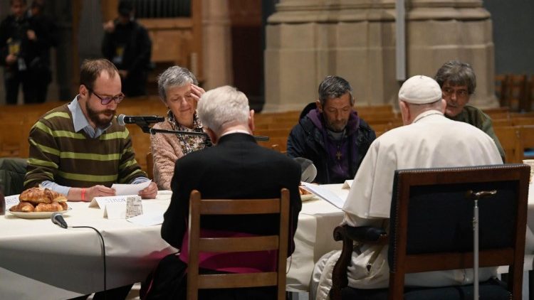 В дорозі до базиліки Пресвятого Серця, Святіший Отець зупинився на парафії Сен-Жіль, де спожив сніданок з групою убогих і біженців, які щодня отримують тут допомогу. Це або місцеві вбогі, або ж мігранти з Африки та зі Східної Європи.