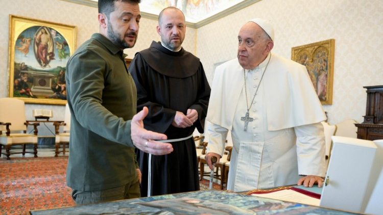 Президент України подарував Святішому Отцю картину «Бучанська різанина: історія Марічки» ірпінських художників Володимира Козюка та Владислава Задворського, на якій бачимо зображену дівчинку, яка «втратила все: її дім, її сім'ю, її дитинство. На її очах катували і вбили її батька, матір, бабусю… Її рідне місто, Буча, стало свідком нелюдських звірств, які назавжди залишили шрами на її душі», – читаємо в описі картини. Папа Франциск подарував бронзове лиття з алегорією: «Мир – це делікатна квітка», добірку документів понтифікату, між якими – цьогорічне послання на день миру, та книгу «Переслідувані за правду. Українські греко-католики за залізною завісою», яка побачила світ у Ватиканському книжковому видавництві.