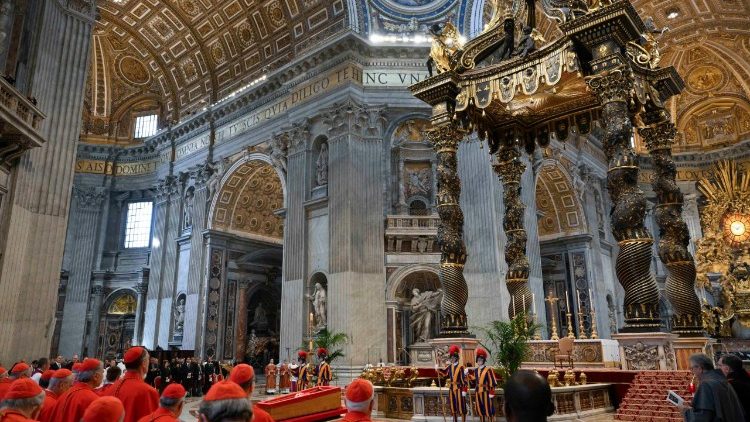 У середу, 23 квітня 2025 р., в день літургійного спомину святого мученика Юрія, іменин Папи Франциска, який до обрання на Наступника святого Петра носив ім’я Хорхе, тобто, Юрій іспанською мовою, його тіло було перенесене до базиліки Святого Петра та поставлене перед головним вівтарем, спорудженим над місцем поховання першого Папи, святого апостола Петра. Протягом двох днів, у середу та четвер, базиліка буде відчинена до 24:00, а в пʼятницю – до 19:00 щоб вірні могли прийти попрощатися з пастирем, який понад 12 років провадив Католицьку Церкву. Як стало відомо, всі входитимуть до храму через Святі Двері, відчинені з нагоди Ювілею. В суботу, 26 квітня, відбудеться похорон, який буде відслужений на площі Святого Петра, звідки Папа Франциск здійснить «останню прощу» до базиліки Пресвятої Марії, де згідно із заповітом його тіло залишиться на вічний спочинок у надії воскресіння.