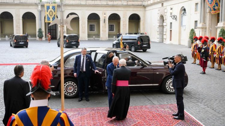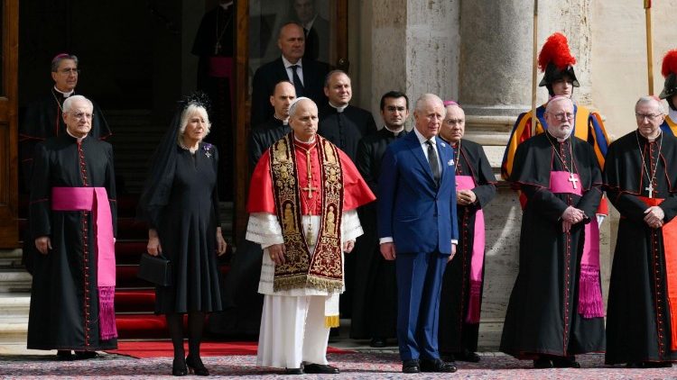 Королівська пара прибула до Ватикану о 10:50. Їх зустріли на внутрішньому подвірʼї Святого Дамазія, згідно з протоколом державних візитів. Після того, як оркестр Жандармерії виконав гімн «God Save the King», у супроводі почесної варти швейцарських гвардійців король Чарльз III і королева Камілла увійшли до Апостольського палацу. Далі відбулася приватна аудієнція Папи з монархами, а потім кілька паралельних зустрічей: королева Камілла відвідала Паолінську каплицю, а король Чарльз провів переговори в Державному Секретаріаті з кардиналом П'єтро Пароліном.