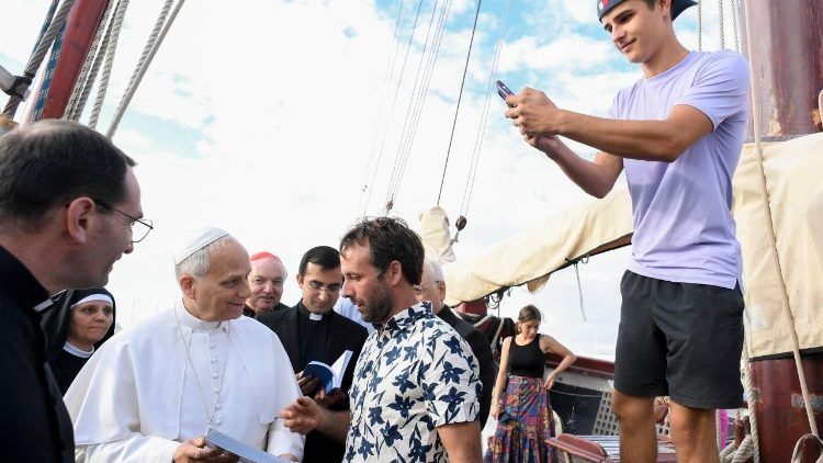 У пʼятницю, 17 жовтня 2025 р., Святіший Отець відвідав судно, яке причалило в туристичному порту Остії поблизу Риму. Папа на борту. Навколо нього 25 юнаків і дівчат, екіпаж цього судна 40-х років, довжиною 29 метрів, що розраховане на 35 спальних місць, яке під французьким прапором вже вісім місяців курсує від порту до порту, несучи послання братерства на цьому перехресті зустрічей і діалогу, яким є Середземне море. Вони походять з Боснії та Алжиру, Іспанії та Палестини, Франції та Пакистану, і зупинялися в Ла-Валлетті, Тунісі, на Криті, в Стамбулі (де зустрілися з патріархом Вартоломеєм), Равенні, Неаполі. Вони мали прибути до Чівітавекк'ї, але змінили маршрут на пропозицію самого Папи Лева, який сказав, що якщо вони причалять в Остії, то, можливо, він зможе до них приєднатися.