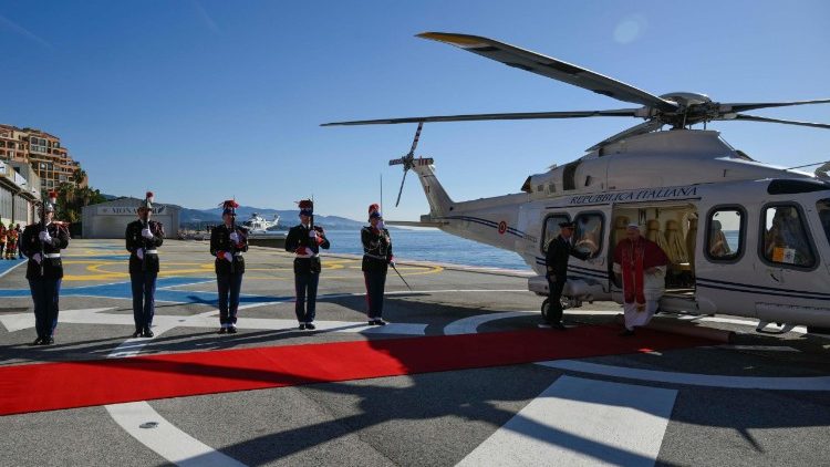 Святішого Отця зустріли Князь і Княгиня Монако Альбер ІІ і Шарлен. Віддано військові почесті та відбулося взаємне представлення делегацій. Офіційна зустріч не передбачала промов. З вертодрому Папа та монархи вирушили до княжого палацу.