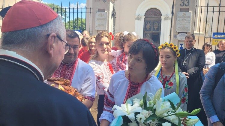 «Мої вітання – це не лише мої вітання, я переказую вам близькість, присутність і благословення Святішого Отця Франциска», – сказав кардинал Пʼєтро Паролін, вітаючись із усіма присутніми в храмі. Він підкреслив, що Папа з великою увагою, з великою стурбованістю та великим болем слідкує за ситуацією. «Це момент, коли я можу розділити ваш біль. Я відчув його в особливий спосіб від учора, коли ступив у вашу країну. А тепер про нього нагадав і єпископ, вшановуючи пам'ять полеглих у цій війні. І так само горе тих, хто втратив близьких, тих, хто був поранений, – мені сказали, що багато з них отримали інвалідність, – тих, хто журиться через знищення свого майна, тих, хто був змушений покинути свої домівки і шукати притулку в іншому місці. Горе всіх тих, кого так чи інакше торкнулася ця жахлива війна».