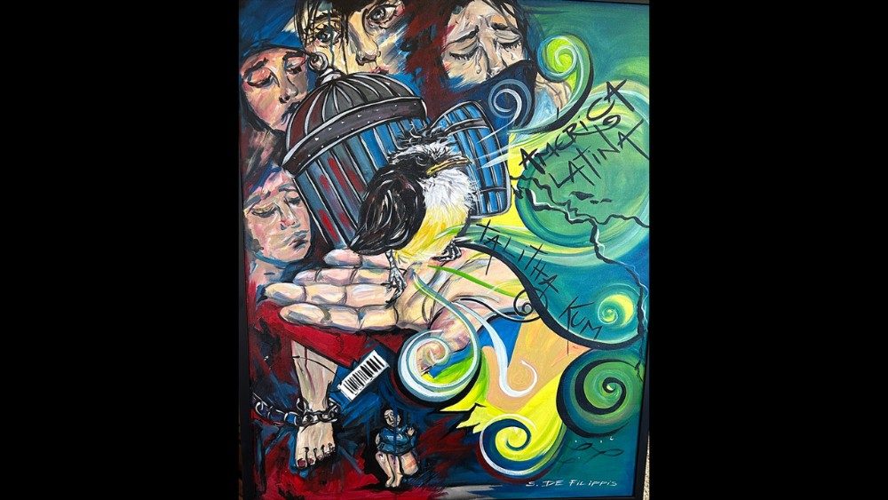 交流结束之际,修女们赠送给卡蜜拉王后一幅极具象征意义的画。这幅画的作者是该联合会打击人口贩运全球网络塔里塔古木(Talitha Kum)的成员德菲利皮斯(Sandra De Filippis)修女。画作描绘了几名妇女和孩童受伤却坚毅的面容,他们都是人口贩运的幸存者;正中央有一只张开的手,掌心的鸟儿正要展翅飞翔。塔里塔古木国际协调人阿韦利诺(Abby Avelino)修女解释道,「即使痛彻心扉,也能有光明、美好和希望」。