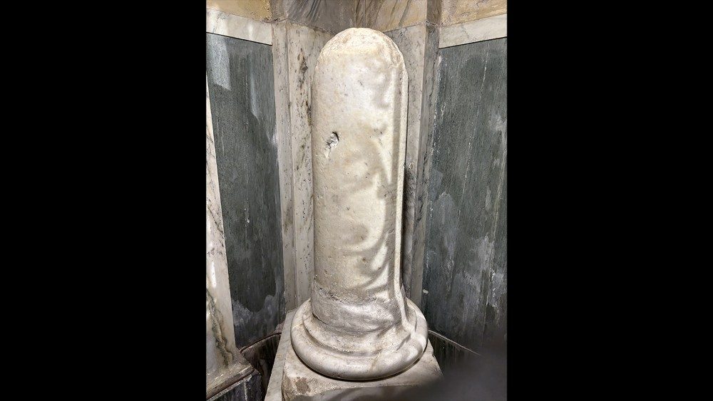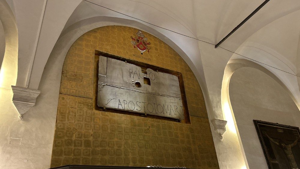 通过格栅,可以看到地面以下的一块由两块大理石组成的石板,长2.12米,宽1.27米。上面刻有“保禄宗徒殉道者”(PAULO APOSTOLO MART)的字样,并有三个孔:一个圆形和两个方形。这块石板可以追溯到公元四至五世纪,是早期对这个地方敬拜的见证,甚至在大殿建成之前。这些孔的功能是获取“接触性圣髑”,即将布条插入孔中以触及墓穴。