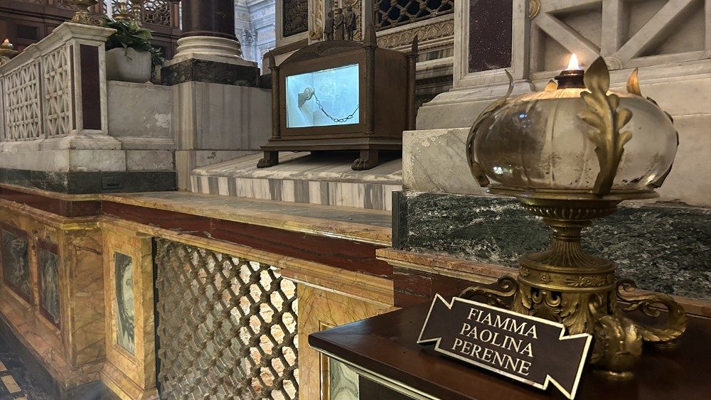 在祭台脚下,著名雕塑家阿诺尔夫·迪坎比奥(Arnolfo di Cambio)于1285年制作的精美华盖之下,可以看到2006年研究人员发现的石棺石块。一盏小灯昼夜不息地燃烧,彰显著这里的神圣。旁边是一个青铜和玻璃制的棺匣,装有保禄在罗马被囚禁时留下的锁链,这锁链自公元四世纪以来一直保存在大殿内,并在每年6月29日圣伯多禄和圣保禄宗徒瞻礼在大殿内的游行中向人展示。