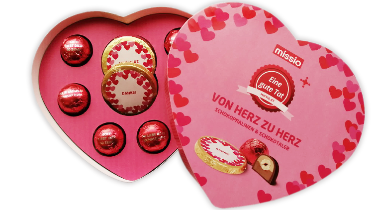 Missio Österreich will das Leben von Maansi und vielen anderen Mädchen zum Besseren verändern. Dazu bietet das Hilfswerk „fair, umweltfreundlich und in Österreich produzierte" Schokopralinen und Schokotaler. Missio-Nationaldirektor Pater Karl Wallner: „Ein Herz ist das Symbol der Liebe, die wir uns gegenseitig schenken. Durch das Missio-Herz strahlt diese Liebe auch in das Leben armer Mädchen in Nordindien.“ Die Missio-Schokoherzen können in der Missio-Nationaldirektion in der Wiener Seilerstätte erworben oder online bestellt werden. Eine Einzelpackung (130 g): kostet € 8,90; 1 Karton mit 6 Herzen: € 53,40 - jeweils inkl. USt, exkl. Versandkosten. Auch ein Versand außerhalb Österreichs ist möglich.