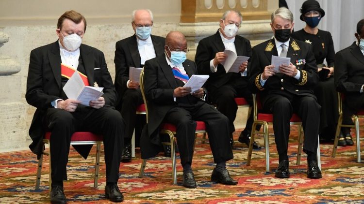 Anders als gewohnt empfing Franziskus die Botschafter in der Benediktionsaula im Petersdom und nicht in einem Saal des Apostolischen Palastes. In der Benediktionsaula lässt sich leichter Abstand halten, wie sich das in Corona-Zeiten so gehört. Natürlich ging es auch in Franziskus‘ Ansprache vor allem um das tückische Virus.
