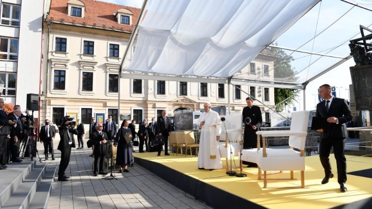 15.000 Juden lebten im Jahr 1940 in Bratislava, zu Deutsch Preßburg; den Krieg überlebten nur 3.500 von ihnen. „Ich gehöre zu einer Generation, die ihre Großeltern nicht gekannt hat und sich auch an ihre Eltern nicht erinnert“, sagte ein Holocaust-Überlebender in einer kurzen Ansprache bei der Begegnung mit dem Papst. „Ich bin Jahrgang 1942; als ich drei Monate alt war, wurde mein Vater deportiert, und seine Spuren verloren sich. Erst fünfzig Jahre später habe ich, nach Öffnung der Archive, erfahren, dass er in der Ukraine gestorben ist.“