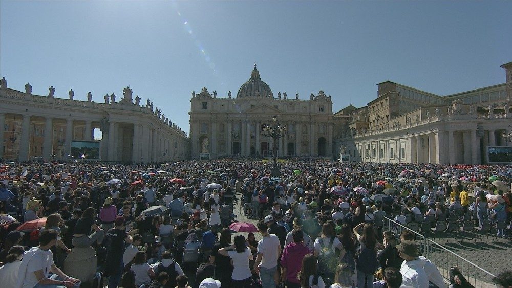 Der Papst erinnerte daran in seiner Ansprache: „Zwei Jahre sind vergangen mit einem leeren Platz", einem „Platz, der eine Fastenzeit durchgemacht hat" und nun voller Freude ist, auch wenn leider „dicke Wolken" nach wie vor „unsere Zeit" verdunkeln. Es ist die "Dunkelheit, die alle erschreckt", der "schreckliche Krieg", für den "viele eurer Altersgenossen" den höchsten Preis zahlen". Viele warten noch immer auf das Osterlicht, sagte der Papst.
