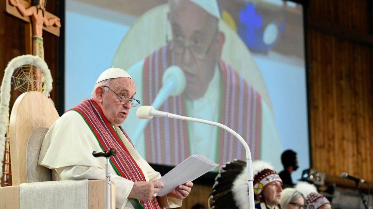 Liebe indigene Brüder und Schwestern, ich bin als Pilger gekommen, um euch auch zu sagen, wie wertvoll ihr für mich und für die Kirche seid. Ich wünsche mir, dass die Kirche mit euch verflochten sei, so eng verwoben und vereint wie die Fäden der bunten Bänder, die so viele von euch tragen. Möge der Herr uns helfen, im Heilungsprozess voranzukommen, hin zu einer immer heileren und erneuerten Zukunft. Ich glaube, das ist auch der Wunsch eurer Großmütter und Großväter. Mögen die Großeltern Jesu, die heiligen Joachim und Anna, unseren Weg segnen.