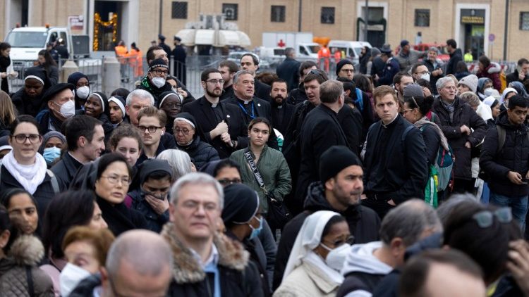 Laut dem vatikanischen Presseamt kamen bis 19 Uhr diesen Montag 65.000 Menschen in den Petersdom, vor 12 Uhr am Dienstag waren es bereits weitere 25.000. Schon vor der Öffnung der Basilika bildete sich eine lange Schlange von Menschen auf der Via della Conciliazione, die dem 2013 von seinem Amt zurückgetretenen Papst die letzte Ehre erweisen wollten. Noch bis Mittwochabend um 19 Uhr ist der Petersdom für Trauergäste geöffnet, die am aufgebahrten Leichnam des Papstes aus Deutschland kurz innehalten oder beten wollen.