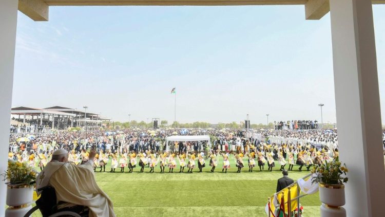 Mit dem Wunsch, dass sie als positives Beispiel den Friedensprozess voranbringen und selbst Frieden erfahren mögen, beendete der Papst seine Predigt vor den Teilnehmern an der Messe, unter ihnen auch Präsident Kiir und zahlreiche weitere Autoritäten aus Politik und Gesellschaft.