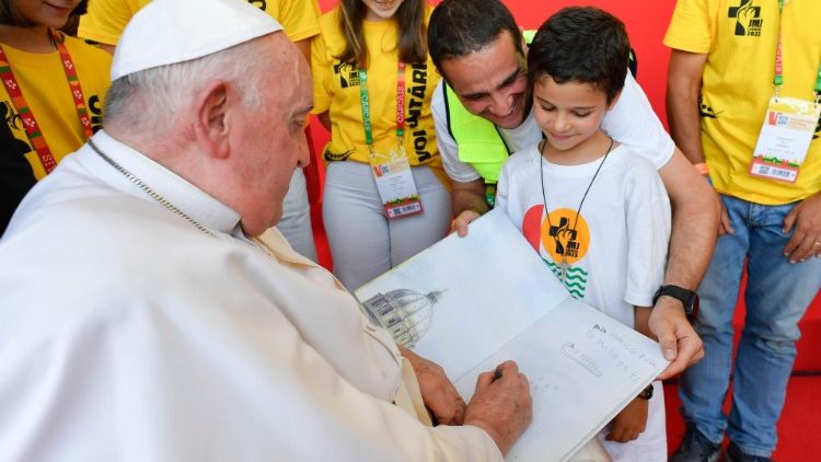 Und nun möchte ich das, was ihr uns in euren schönen Zeugnissen erzählt habt, noch verstärken. Den Zeugnissen von Chiara, Francisco und Filipe: Ihr alle drei habt uns von einer besonderen Begegnung mit Jesus erzählt. Ihr habt uns daran erinnert, dass die schönste Begegnung, der Motor aller anderen, diejenige, die das Leben wirklich voranbringt, die Begegnung mit Jesus ist. Das ist die wichtigste Begegnung in unserem Leben. Die persönliche Begegnung mit Jesus jeden Tag zu erneuern, ist das Herzstück des christlichen Lebens. Und man muss sie jeden Tag erneuern, um sie frisch zu halten, nicht nur im Kopf, sondern auch im Herzen. Und dann erfährt man, dass ein kleines „Ja“ zu Jesus das eigene Leben verändern kann. Aber auch ein „Ja“, das man zu anderen sagt, tut gut; wenn man sich in den Dienst stellt: im Moment der Müdigkeit, habt ihr euch wieder aufgerichtet und „ja“ gesagt, um den anderen zu dienen.