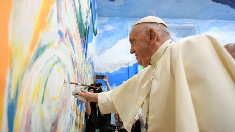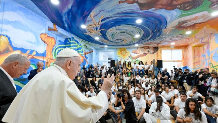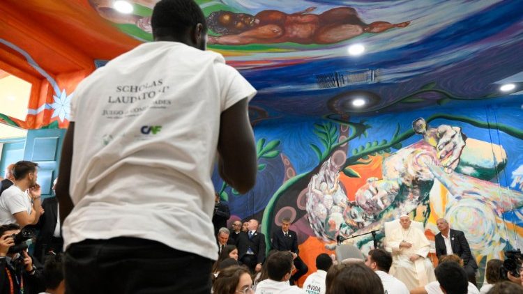 Es erinnere ihn ein bisschen an die Sixtinische Kapelle, scherzte der Papst angesichts des Wandbilds. Das, wenn man alles zusammennimmt, etwa drei Kilometer lange Opus wurde im Lauf der letzten Monate von über 2.000 Menschen ganz unterschiedlicher Herkunft und Hintergrunds erstellt – und so sieht es auch aus, bunt und etwas durcheinander. Kein Wunder, dass es beim Frage-Antwort-Spiel zwischen den anwesenden Schülerinnen und Schülern und dem Papst vor allem ums Thema Chaos ging.