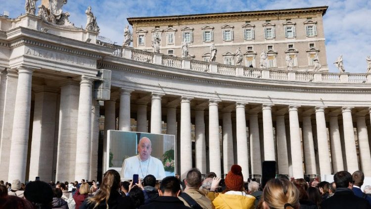 „Heute kann ich mich nicht vom Fenster (des Apostolischen Palasts) an euch wenden, weil ich dieses Problem mit einer Entzündung im Lungenbereich habe. Mons. Braida wird die Katechese verlesen. Er ist ja auch derjenige, der diese Katechesen immer so gut schreibt. Vielen Dank, dass ihr heute mit dabei seid.“