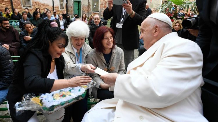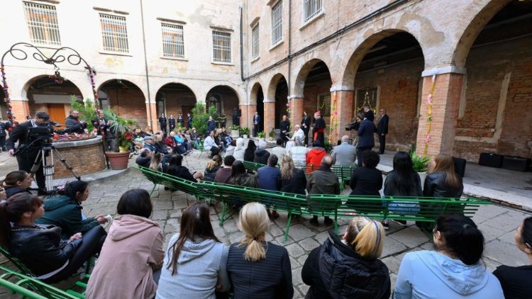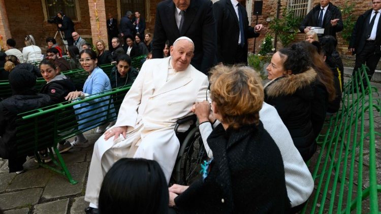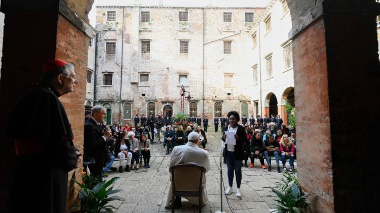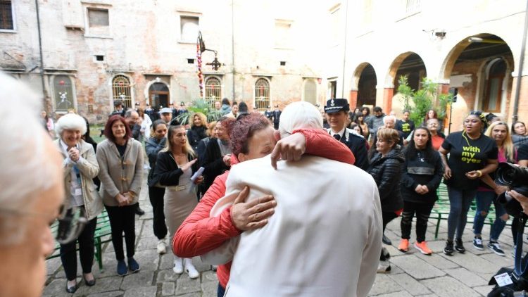 Das Frauengefängnis, das in einem früheren Benediktinerinnen-Kloster untergebracht ist, beherbergt auch den Pavillon des Heiligen Stuhls auf der diesjährigen, 60. Biennale. Es ist der erste Besuch eines Papstes auf der alljährlichen Kunstschau. Doch setzte der erste Termin der Visite im Frauengefängnis einen vor allem seelsorglichen Akzent. Die Insassinnen der Haftanstalt – etwa achtzig Frauen und Mädchen, darunter viele Ausländerinnen – konnten Franziskus einzeln begrüßen; einige umarmten den Gast aus Rom, viele wirkten bewegt.