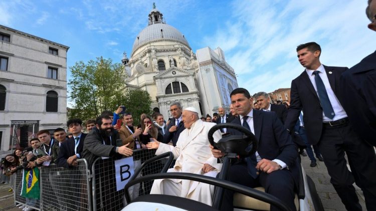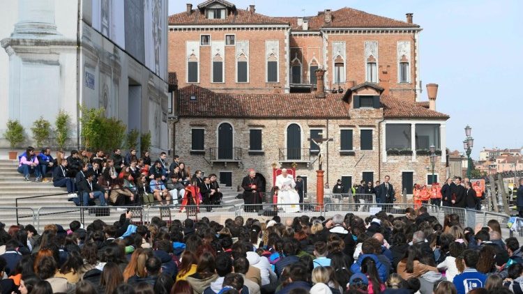 Der Himmel über dem Canale Grande war bedeckt, doch das Szenario malerisch: Die Begegnung des 87-jährigen Papstes mit etwa 1.500 jungen Leuten aus dem ganzen Veneto fand auf der Landspitze vor der Kirche Santa Maria della Salute statt, direkt am Hauptkanal Venedigs. Dort, wo Benedikt XVI. 2011 über die „liquide Gesellschaft“ sinniert hat. Von hier schweift der Blick hinüber zum Markusplatz, der Dogenpalast und die Kuppeln von San Marco sind gut zu sehen.