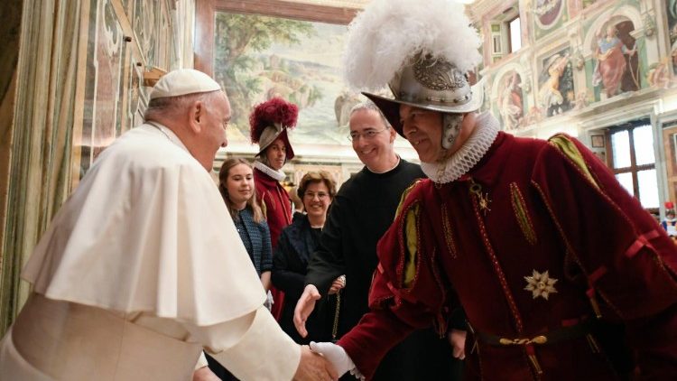 Er habe sich mit Kommandant Christoph Graf und dem Kaplan der Schweizergarde ausgetauscht und dabei viel Erfreuliches gehört, sagte der Papst weiter: „Unter euch herrscht ein sehr guter Korpsgeist, eine positive und respektvolle Atmosphäre in der Kaserne, ein höfliches Verhalten gegenüber den Vorgesetzten und Gästen, trotz manchmal langer anstrengender Dienstzeiten, die ihr aufgrund eurer etwas geringeren Personalstärke zu leisten habt.“ Besonders freue ihn, dass seine Gardisten ein gutes Verhältnis untereinander hätten und auch einmal gemeinsam Ausflüge, ja sogar Urlaub machten.