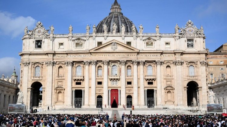 Durch den Torbogen unter dem Glockenturm auf der linken Seite des Petersdoms erreichte die Prozession den Petersplatz, wo sich etwa 20.000 Gläubige eingefunden hatten, um die Überführung des Papstes in die Basilika zu begleiten. Über die große Treppe auf dem Vorplatz, auf dem bis vor wenigen Stunden noch der große Baldachin aufgebaut war, betrat die lange Prozession über das Hauptportal den Petersdom. Der im offenen Sarg liegende Papst, relativ am Ende der langen Prozession und direkt hinter den Kardinälen, gefolgt von den Familienangehörigen und engsten Mitarbeitern, wurde von den Gläubigen mit immer wieder aufflammendem Applaus begrüßt.