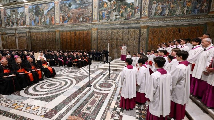 „Ohne Lieder gibt es kein Weihnachten“, sagte der Papst in seiner kurzen Dankesrede an den Chor der Sixtinischen Kapelle. „Überall auf der Welt, in jeder Sprache und Nation, wird das Ereignis von Bethlehem mit Musik und Gesang gefeiert.“ Schließlich berichte das Evangelium selbst, dass bei der Geburt Jesu die Engel singend den Wunsch nach Frieden auf Erden verkündet hätten.