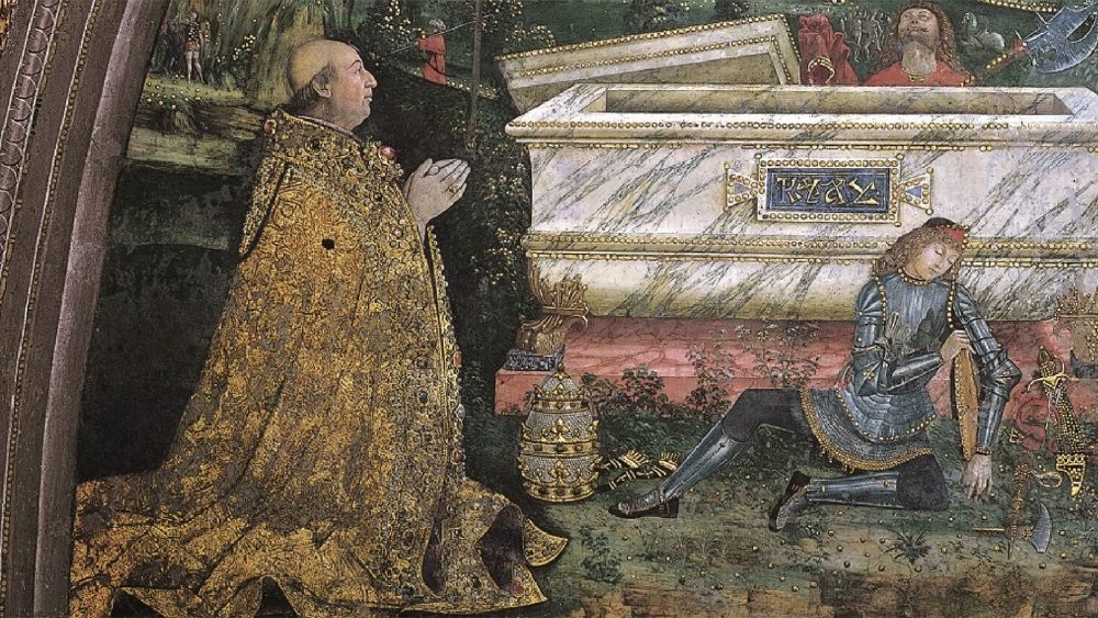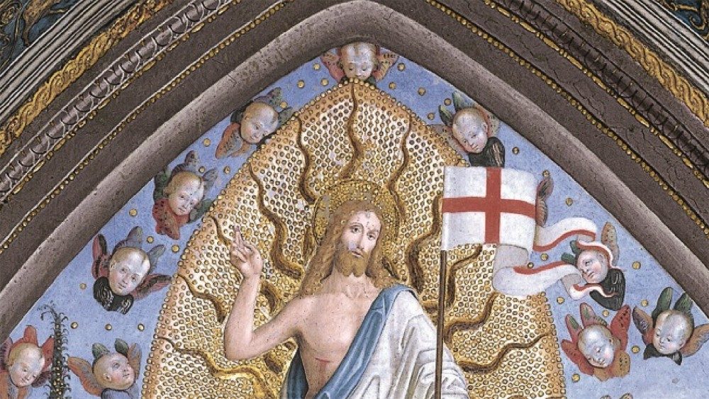 Die auf diesem Meisterwerk des Pinturicchio dargestellte Episode, die sich an ikonographischen Vorbildern des Perugino inspiriert, feiert die Auferstehung Christi, der den Tod besiegt hat und sich – von einem goldenen Lichtstrahl umgeben – über dem Grab erhebt, das nun umsonst von drei jungen Männern in Rüstung bewacht wird. Als Zeugen der Erscheinung Gottes sehen wir den in ein prachtvolles goldenes Pluviale gehüllten Papst Alexander VI., der – das Papstsymbol, die Tiara, neben sich auf dem Boden –, in Kontemplation des unergründlichen Geheimnisses in Gebetshaltung auf dem Boden kniet.