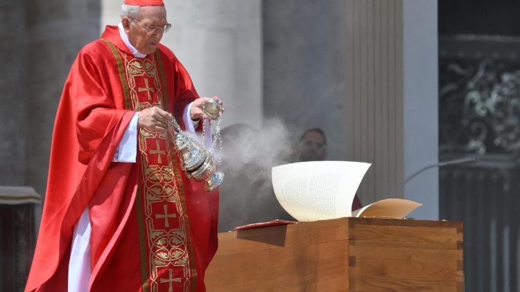 Das Requiem wurde von Kardinal Giovanni Battista Re zelebriert, dem 91-jährigen Dekan des Kardinalskollegiums. Über Rom spannte sich ein herrlich blauer Himmel, doch herrschten rund um den Vatikan scharfe Sicherheitsvorkehrungen. Wer bei der Totenmesse dabeisein wollte, der musste früh aufstehen und viele Kontrollen in Kauf nehmen. Liturgische Farbe auf dem Petersplatz war österliches Rot; auf der Fassade des Petersdoms war eine große Teppich-Darstellung des auferstandenen Christus angebracht. Mit Re konzelebrierten 224 Kardinäle, 750 Bischöfe und viele Priester.