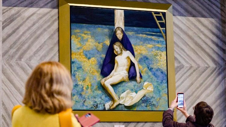 Der Künstler mit einem Bild seines Kreuzswegs im Petersdom Der Künstler mit einem Bild seines Kreuzswegs im Petersdom  (ANSA)