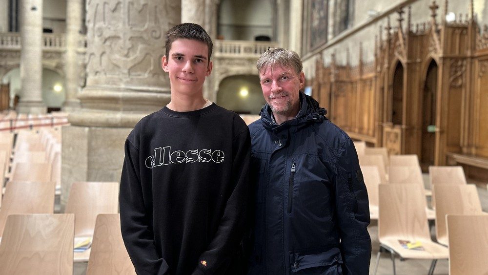 Der 17-jährige David Jeck ist einer von vier Trägern, die Papst Franziskus in der Kathedrale von Luxemburg die Muttergottes der Trösterin der Betrübten bringen dürfen. Sein Vater Marc Jeck hat 1985 beim ersten Papstbesuch in Luxemburg bei der Messe mit Johannes Paul II. ministriert. Blick auf eine katholische Vater-Sohn-Geschichte mit Madonna und zwei Päpsten.