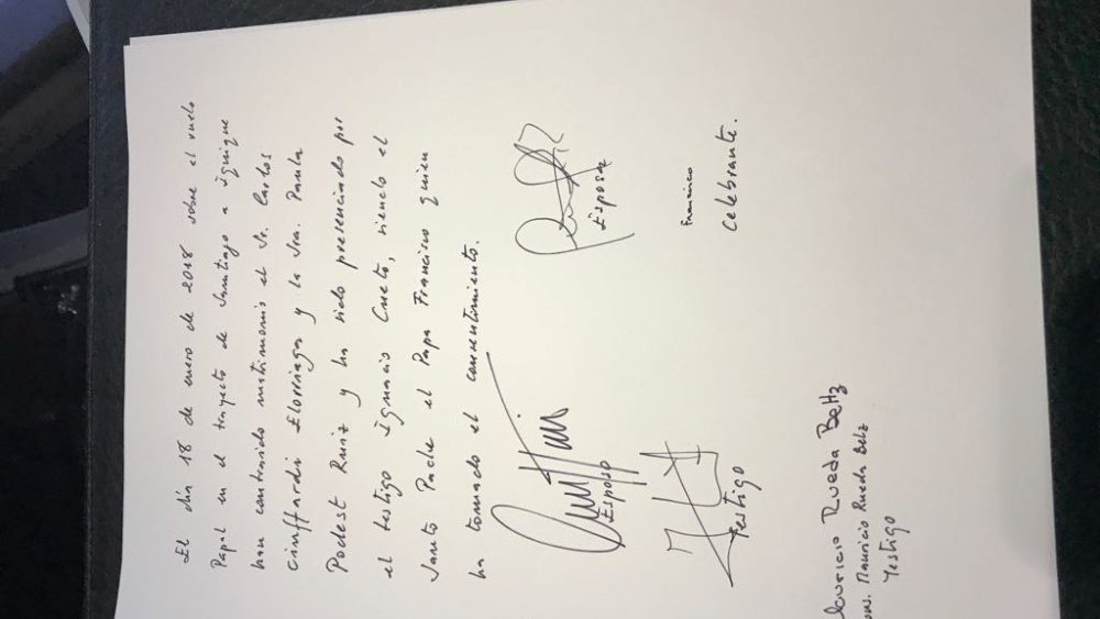 The official marriage certificate reads: "On 18 January 2018, aboard the papal plane from Santiago to Iquique, Mr. Carlos Ciuffardi Elorriaga and Ms. Paula Podest Ruiz contracted marriage, in the presence of the witness, Ignacio Cueto. The Holy Father Pope Francis received their consent."
