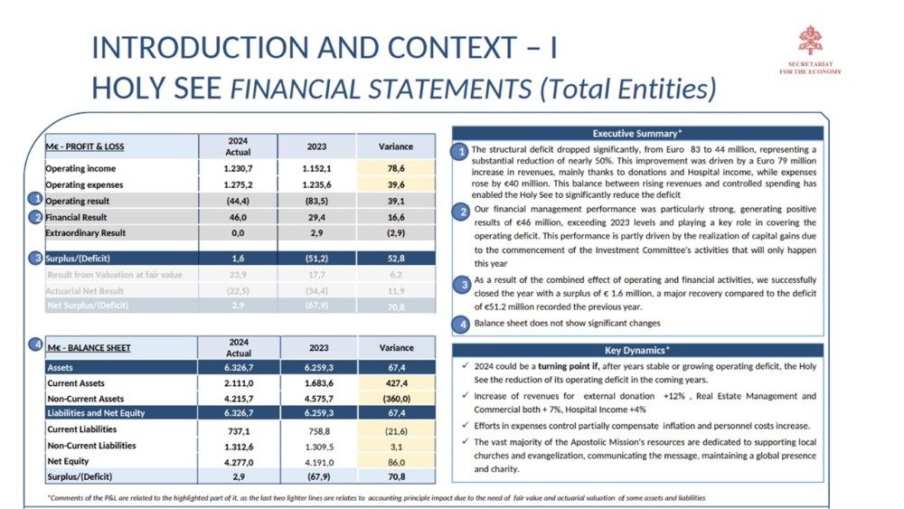 Holy See closes 2024 with a surplus of 1.6 million euro