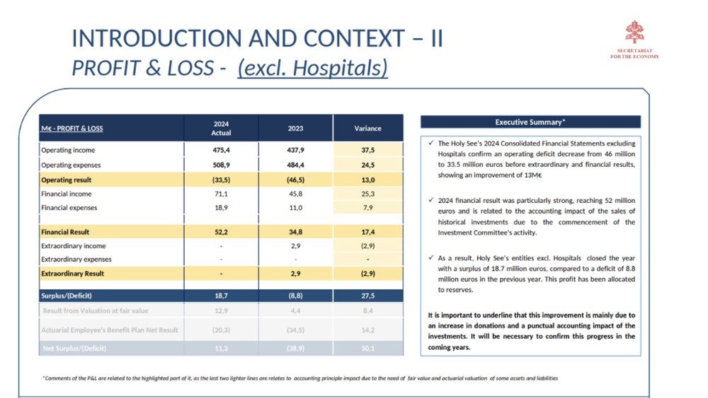 Excluding hospital entities, the Holy See closed with a surplus of 18.7 million euro.