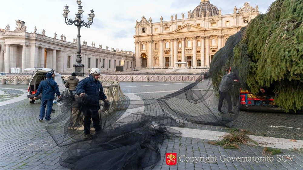 A 25-meter-tall red fir tree is now standing in St. Peter’s Square. This year, the tree comes from the Val d’Ultimo area in the province of Bolzano and was given by the municipalities of Lagundo and Val d’Ultimo, located in the northern part of Italy.