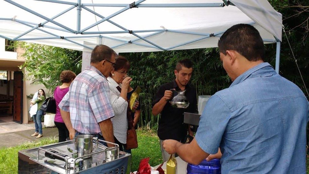 Actividad de difusión y comercialización de Fray Café coordinada por Pastoral Social-Cáritas de la Arquidiócesis de San José. En las parroquias, los fines de semana se aprovecha para que personeros de Fray Café y el Centro Agrícola Cantonal haga una especie de feria y se dé a conocer el producto