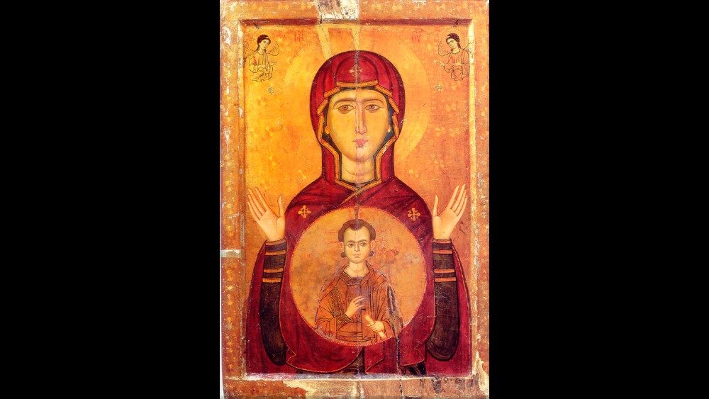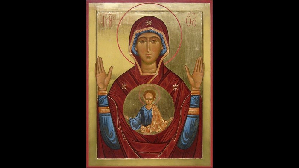 El icono prototipo es el denominado Platytera o Blanquernisa, que podemos ver en la Basílica de Constantinopla y que es conocido como Virgen de la Señal: tiene los brazos abiertos y porta, en el centro de su figura, al Niño bendiciendo. “La Madre de la Señal –explica a Vatican News el iconógrafo don Gianluca Busi, párroco y profesor de la Facultad Teológica de la Emilia Romagna- funde dos modelos: el primero procede de las catacumbas de Priscila y es conocido como la “orante”. Se trata de una figura vestida con la púrpura y con las manos levantadas en forma de “U”, en actitud de oración. El segundo modelo parece ser la vidente de los misterios eleusinos”, ritos religiosos mistéricos que se celebraban cada año en el santuario de la diosa Deméter en la antigua ciudad griega de Eleusis.