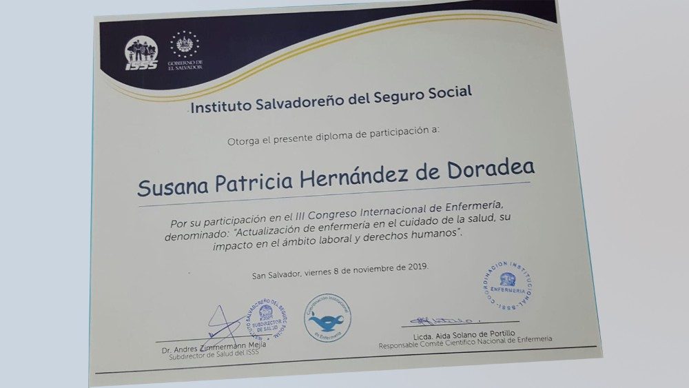 Susana Patricia Hernández de Doradea, trabaja en el hospital General en San Salvador, como enfermera especializada en sala de operaciones. Desde que el país tuvo su primer contagio, en el hospital donde trabaja se ha preparado en el hospital, un área específica llamada Gripal, donde se atiende a todo paciente con este tipo de enfermedad, donde el personal médico y enfermeras, tienen el equipo de protección, para evitar el contagio.